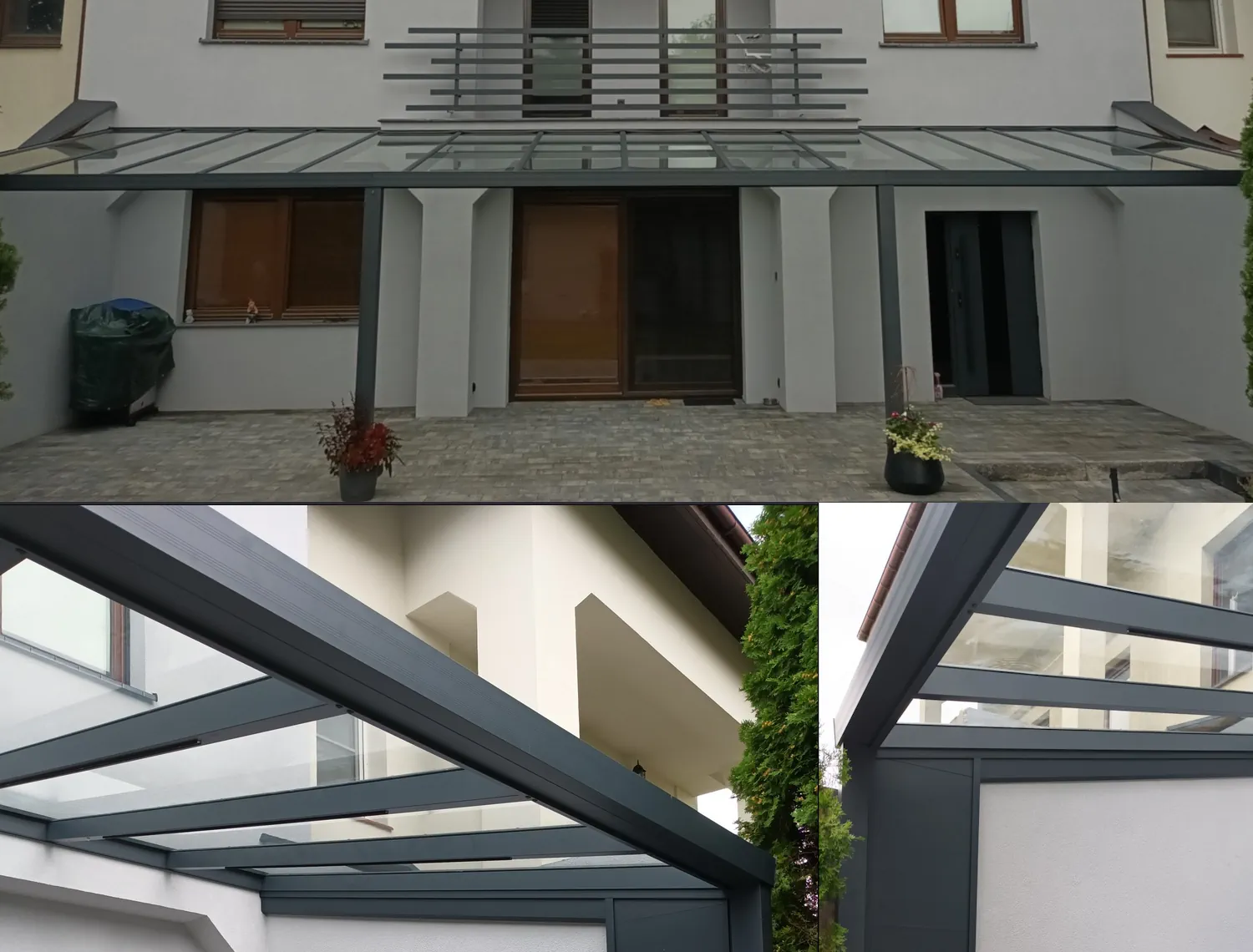 Zadaszenie tarasowe kryte szkłem bezpiecznym z profili w kolorze antracyt: